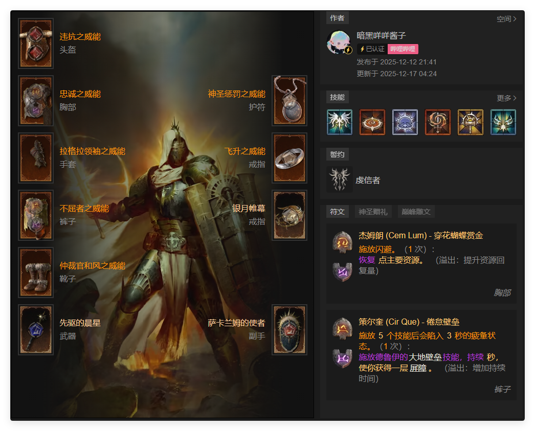 S11 核心玩法:利用 职业专精誓约[虔信者] 配合 [天谴/坠天星落] 刷新 [仲裁官形态],配合核心暗金戒指 [银月帷幕] 实现“闪避自动扔锤子”。
